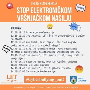 - 12:10 – 12:20 Iva Jovović (LET): Što je cyberbullying i zašto je opasan