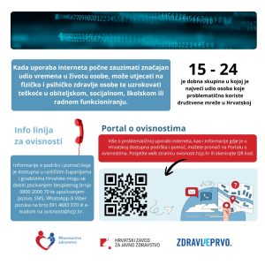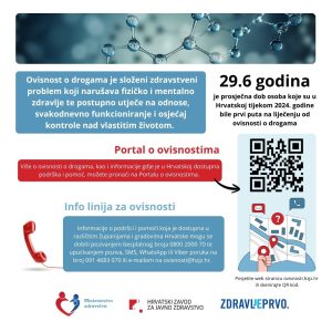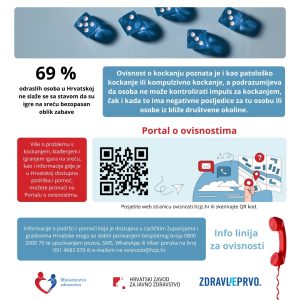 Hrvatski zavod za javno zdravstvo pokrenuo je web stranicu Portal o ovisnostima koji na jednom mjestu objedinjuje sve ključne informacije vezane uz javnozdravstvene aspekte povezane s ovisnostima o alkoholu, duhanu, drogi, kockanju te prekomjernom igranju video igara i provođenju vremena na internetu, a isti je dostupan na poveznici: ovisnosti.hzjz.hr.